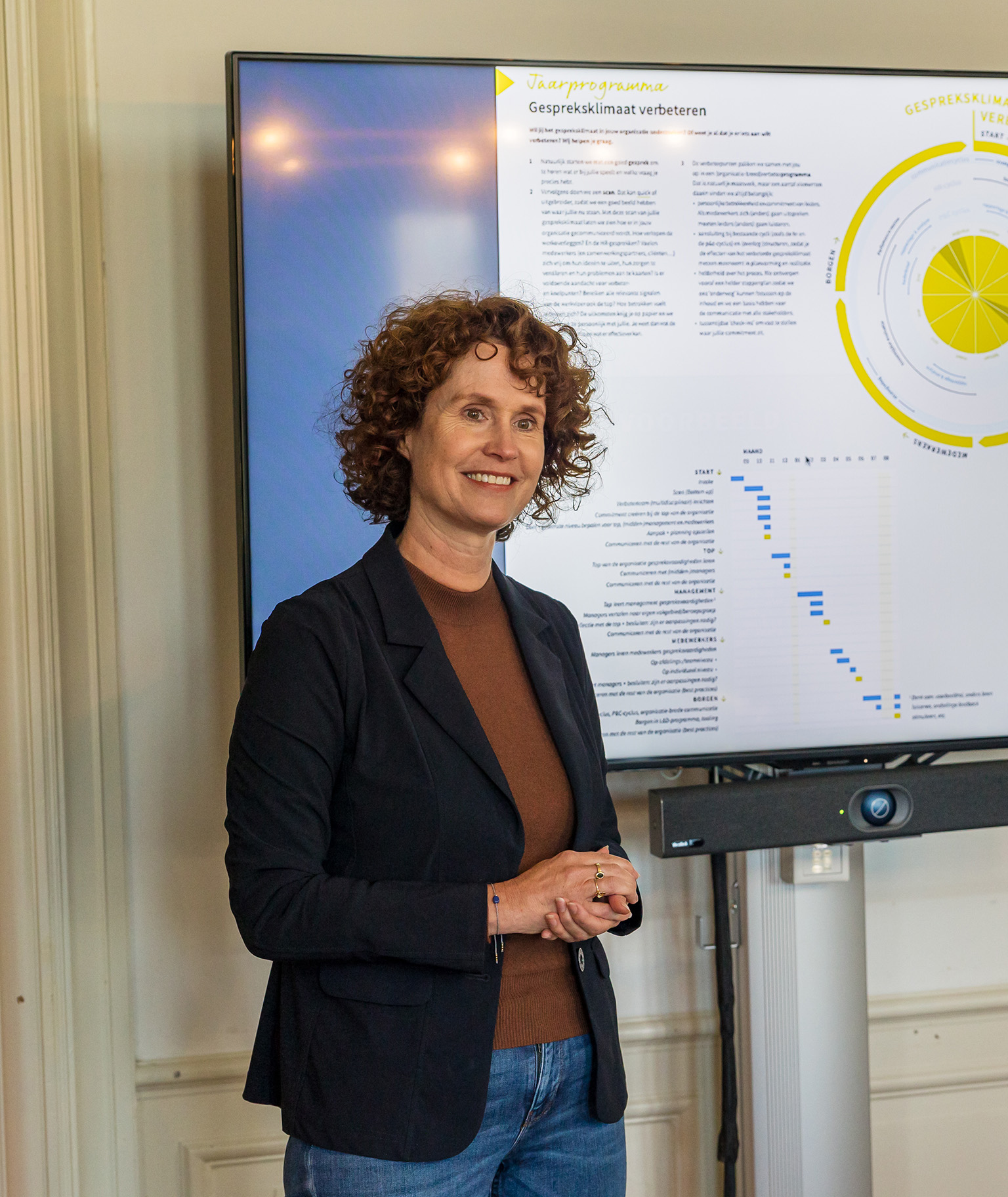 Elke training ontwerpen we op maat. Daarbij putten we uit zo’n veertig gespreksvaardigheden, verdeeld in vier clusters: uitspreken wat je ziet of vindt, verbinding maken in het gesprek, invloed uitoefenen en vergaderingen en gesprekken structureren.